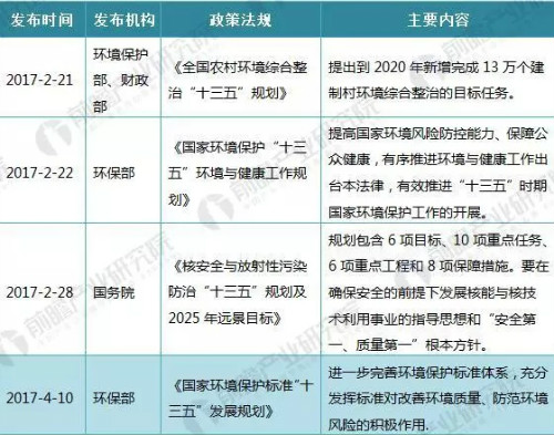 至2017年4月10日,環保部發布《國家環境保護標準“十三五”發展規劃》,進一步完善環境保護標準體系,充分發揮標準對改善環境質量、防范環境風險的積極作用。國家層面政策推進為各部門對環境保護的重視和相關機構的政策落實明確了方向,制定了政策約束。