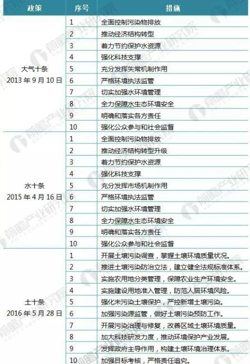 2013年以來,針對國家經濟發展和工業化及制造業發展帶來的大氣污染、水污染和土地污染問題,國家相關部門陸續頒布的大氣十條、水十條和土十條等政策,有效的為細分領域的污染問題提供了處置措施,有效的加強了國家環境保護的政策落實,及國家環境友好型社會的建設。